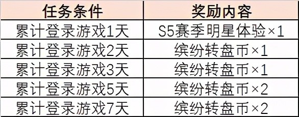 首先是累积7天的登录活动,累积登录7天共计可得6枚缤纷转盘币和一个S5赛季明星体验卡包×1,其中转盘币可以用来抽取待会的转盘活动,等一下再细说。