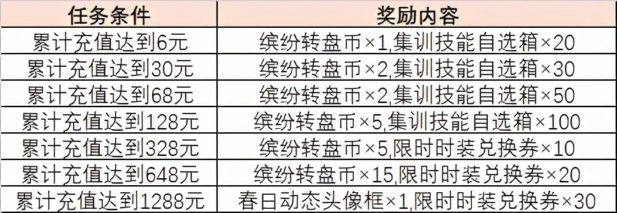 充值1288元可累积得30枚转盘币+200张红蓝自选卡包+60张时装券+春日动态头像框
