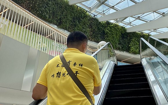 昂子喻乘扶梯去三楼,他的T恤衫上印着“不被盲牵绊,咋想就咋干”。摄影:黄景源