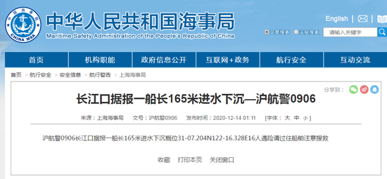 据上海海事局消息,一船长165米进水下沉,概位31-07.204N122-16.328E,16人遇险。请过往船舶注意搜救。