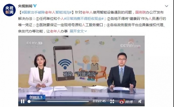 为了破除老年人遇到的“智能鸿沟”问题,国务院办公厅印发《关于切实解决老年人运用智能技术困难的实施方案》,方案指出,我国老龄人口数量快速增长,不少老年人因为不会上网、不会用手机,在出行、就医、消费等日常生活场景遭遇“数字鸿沟”问题日益凸显,为了有效解决老年人在运用智能技术方面遇到的困难,方案聚焦日常生活高频事项和服务场景,提出20条具体的解决措施,方案同时要求到2020年底,老年人享受智能化服务水平显著提升、便捷性不断提高,线上线下服务更加高效协同,解决老年人面临的“数字鸿沟”问题的长效机制基本建立。
